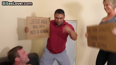 Bisex inked anal babe 3some nailed in kitchen cumswapping